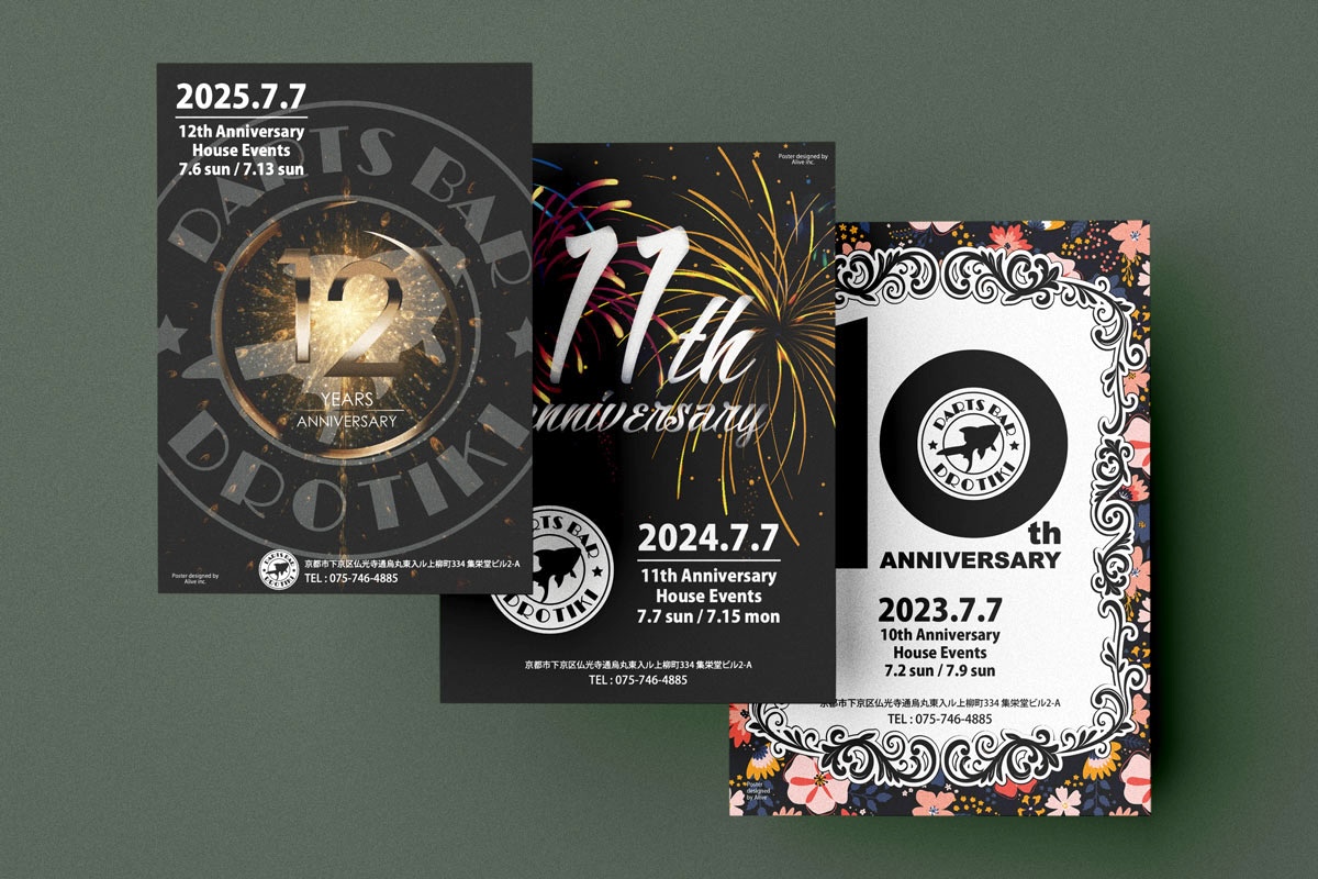京都市四条烏丸にあるダーツバー「DROTIKI」様の周年ポスター制作を担当しています。 毎年継続してご依頼をいただいており、周年ごとにデザインは刷新しつつも、店舗の持つクールな世界観は一貫して維持しています。 視線を引くアクセントを取り入れ、店内外でしっかりと存在感を放つポスターに仕上げました。
