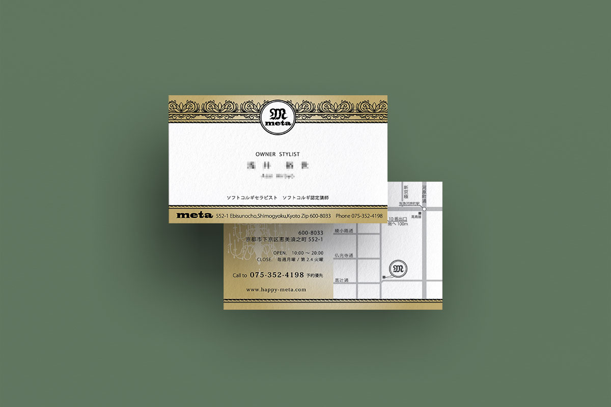 京都市の繁華街にある美容院「meta」様の名刺デザインを制作しました。 ゴシック調の内装が印象的な店舗の世界観に合わせ、重厚感と華やかさを兼ね備えたゴージャスな雰囲気のデザインを採用しています。 店舗のイメージをそのまま手元に残せるよう、素材感やレイアウトにもこだわりました。