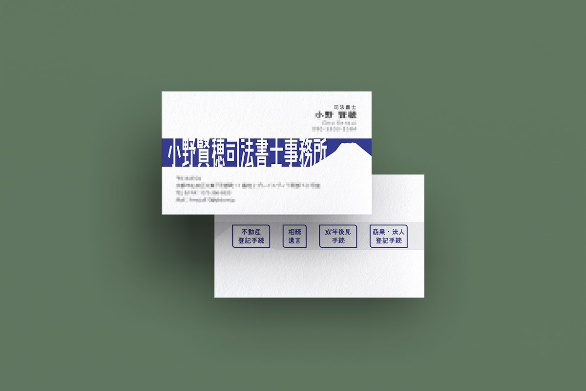 小野賢穂司法書士事務所様の名刺デザインを制作しました。 司法書士としての信頼感を大切にしながら、富士山がお好きというお人柄を反映し、さりげなく遊び心のあるユニークなデザインを採用しています。 堅くなりすぎず、印象に残る名刺に仕上げました。