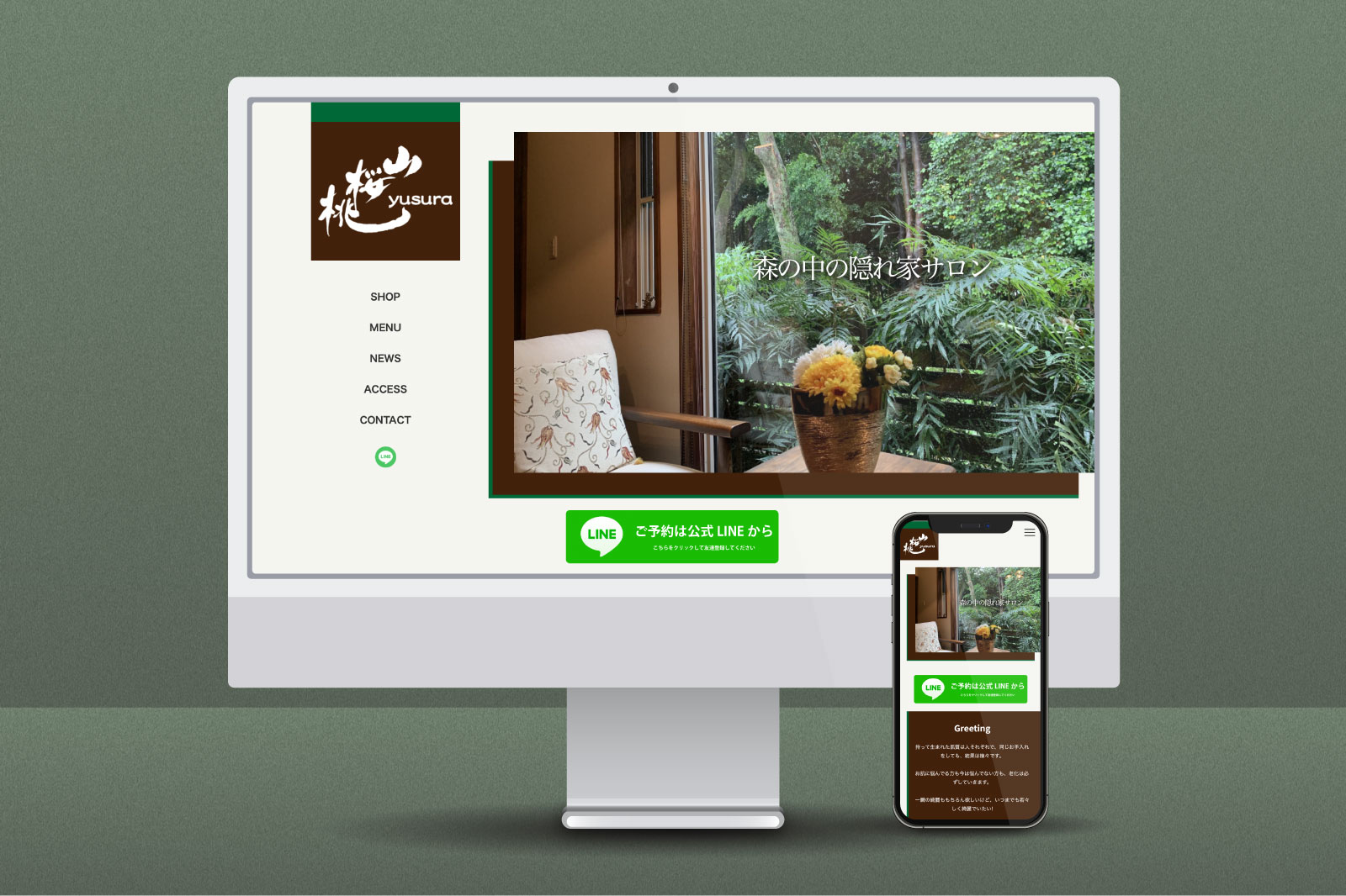 滋賀県守山市にあるプライベートサロン「山桜桃-yusura-」様のWebサイトを制作しました。 神社の森林に囲まれた、自然豊かな環境に佇むサロンで、落ち着いた時間を過ごせるのが特徴です。 女性オーナーならではのやさしさや安心感が伝わるよう、自然を感じさせる配色と柔らかなデザインで、サロンの雰囲気をWebサイトにも反映しています。